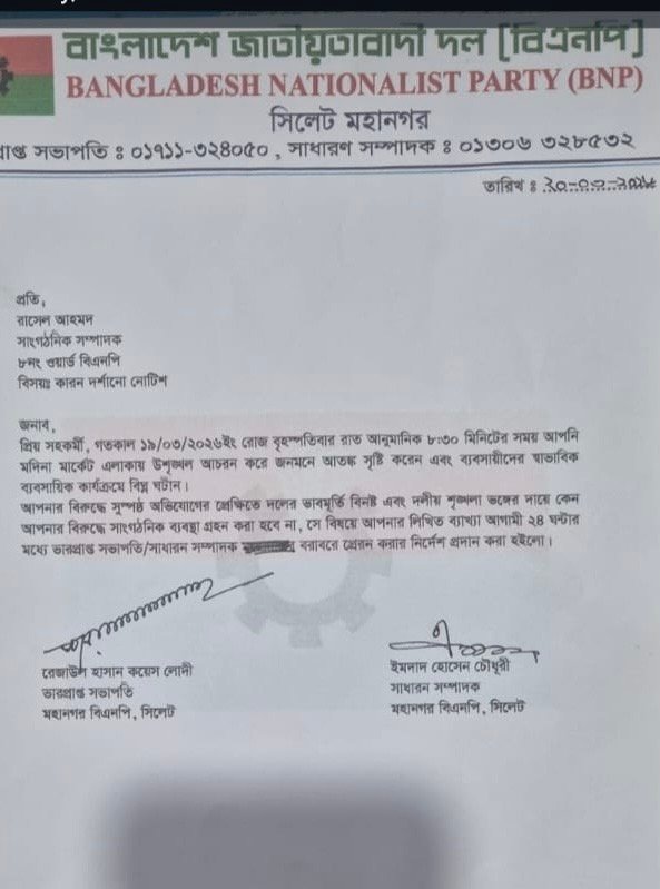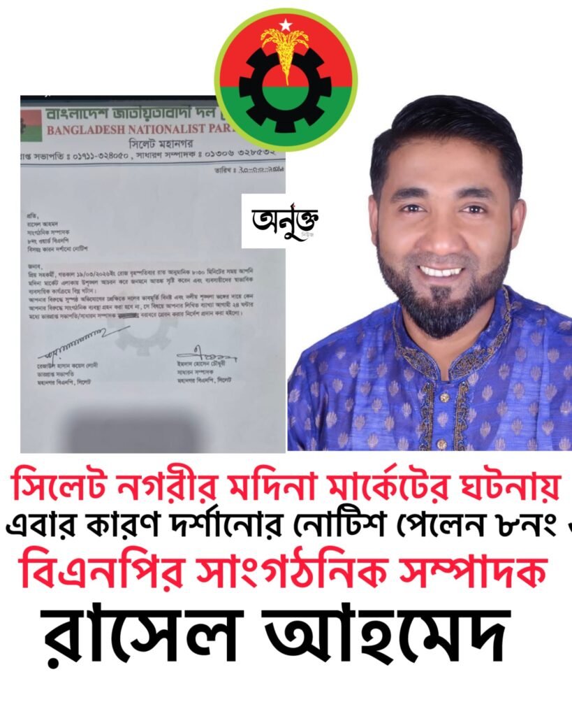 সিলেট নগরীর মদিনা মার্কেটে গত ১৯ মার্চ ২০২৬ বিএনপির দুই গ্রুপের সং/ঘর্ষের ঘটনায় এবার কারণ দর্শানোর নোটিশ দেয়া হয়েছে ৮নং ওর্য়াড বিএনপির সাংগঠনিক সম্পাদক রাসেল আহমদ কে।